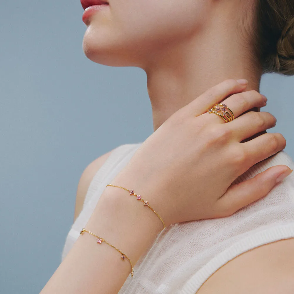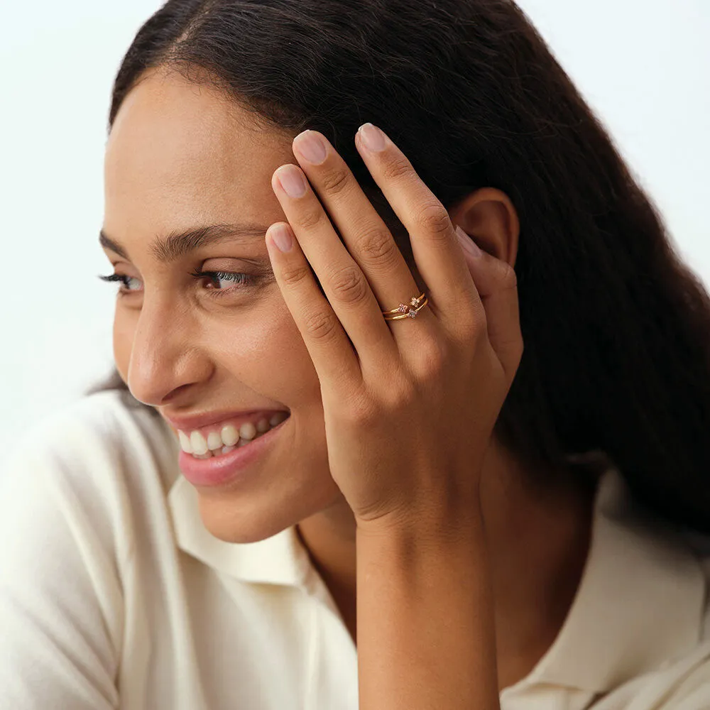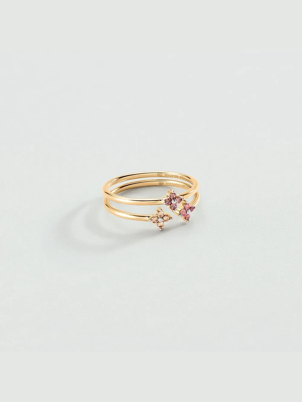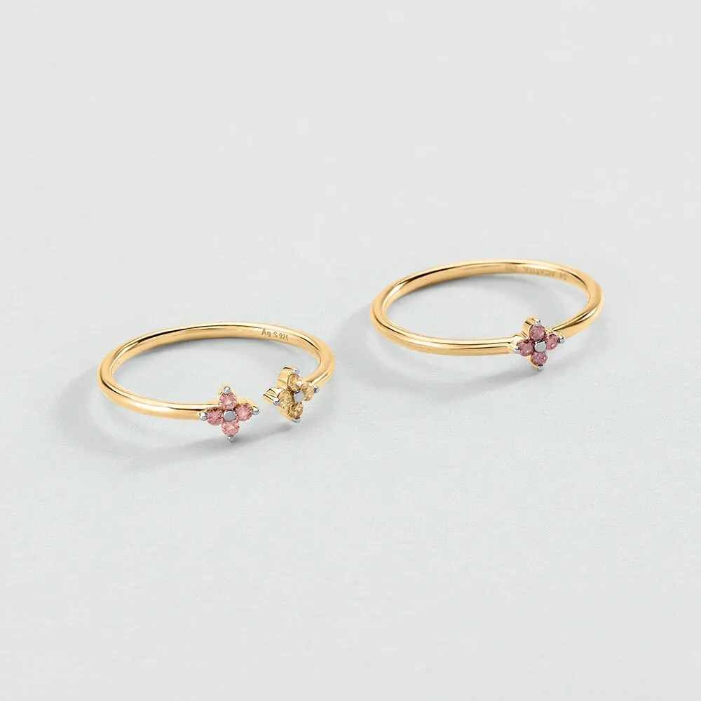 Set de dos anillos finos de plata de ley con baño de oro rosa, diseño floral con circonitas multicolor. Acabado pulido y estilo delicado para combinar a diario o en ocasiones especiales.