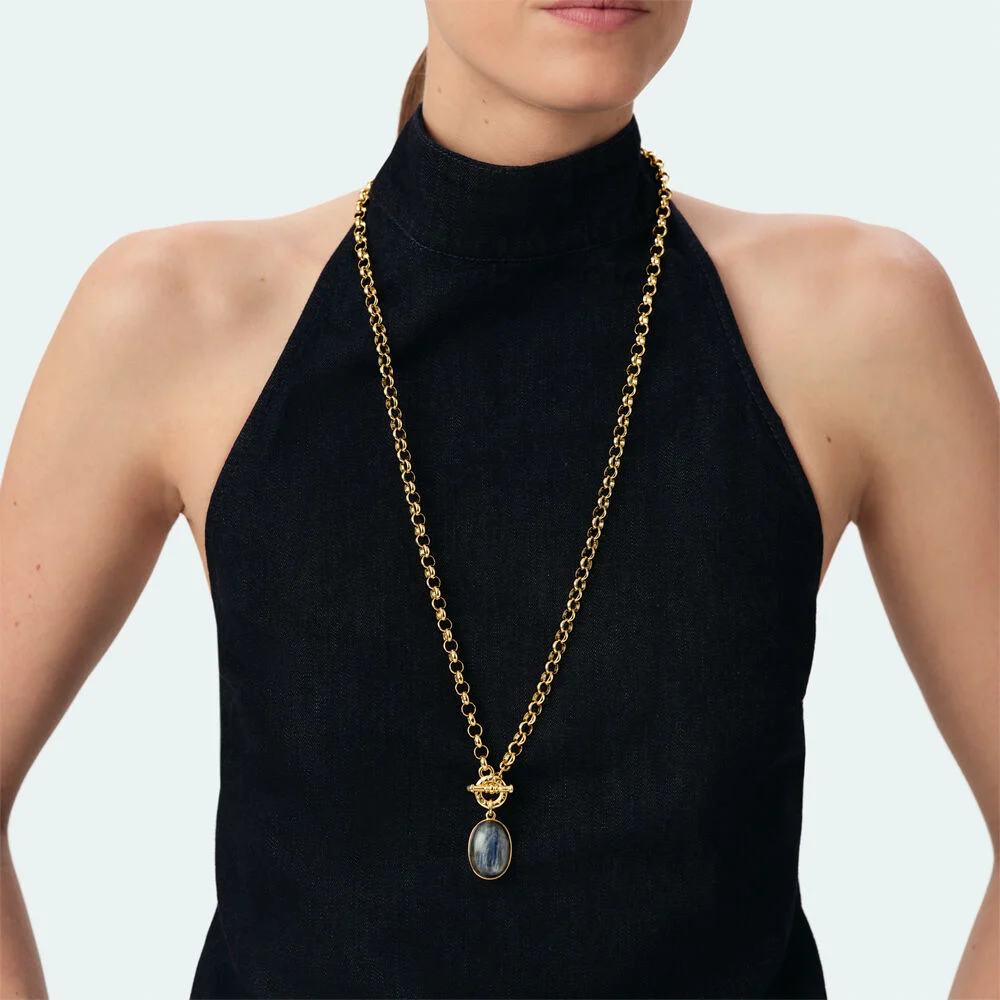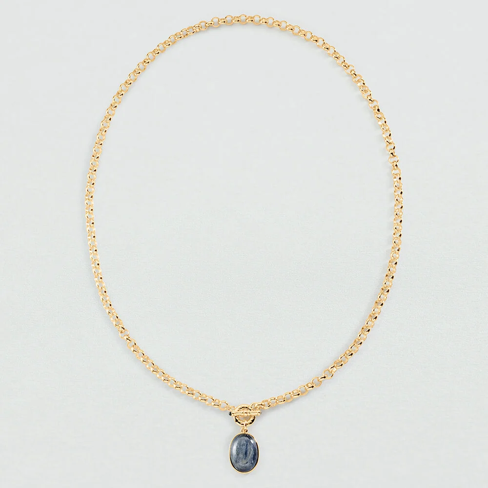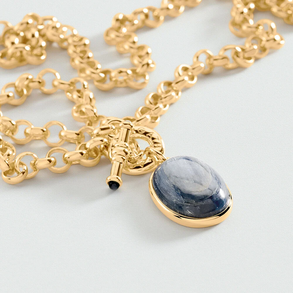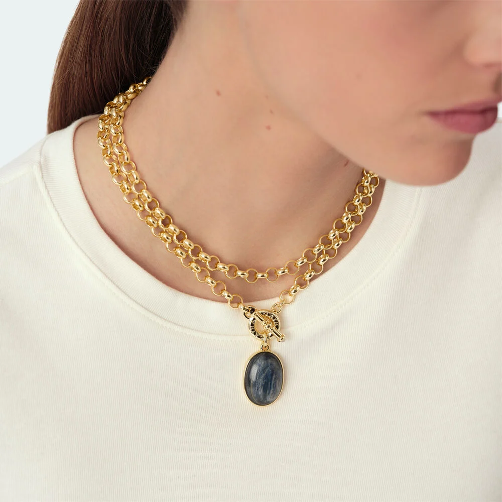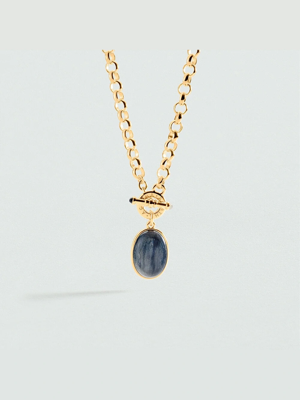 Este collar de Agatha Paris combina un diseño actual con un acabado dorado que aporta luz y personalidad. Collar de cadena de eslabones acabado en oro, con cierre delantero tipo bâton y colgante de piedra natural azul. Es una joya con carácter que destaca por su elegancia, ideal para regalar en una ocasión especial. La longitud aproximada es de 750 mm, ideal para lucir sola o combinada con otras piezas. Está elaborada en aleación metal con baño de oro 750/1000, pensada para acompañarte con estilo en distintas ocasiones.