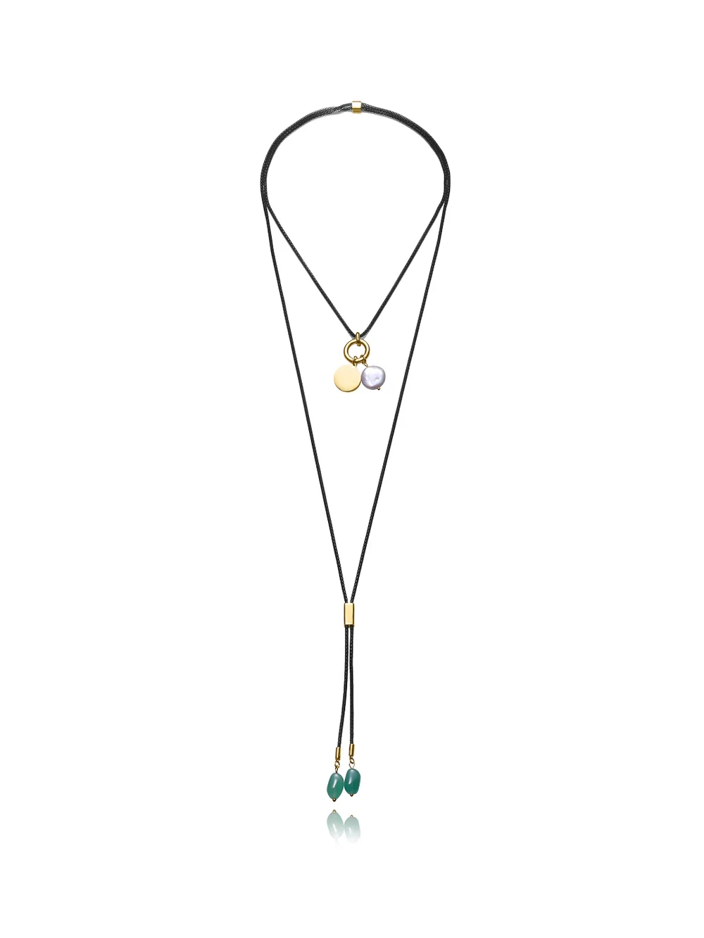 Elegante collar en acero con baño IP negro que destaca por su sofisticado diseño en forma de Y. Esta pieza combina la calidez del acabado dorado en su disco central con la belleza natural de la madreperla y una cautivadora piedra verde.