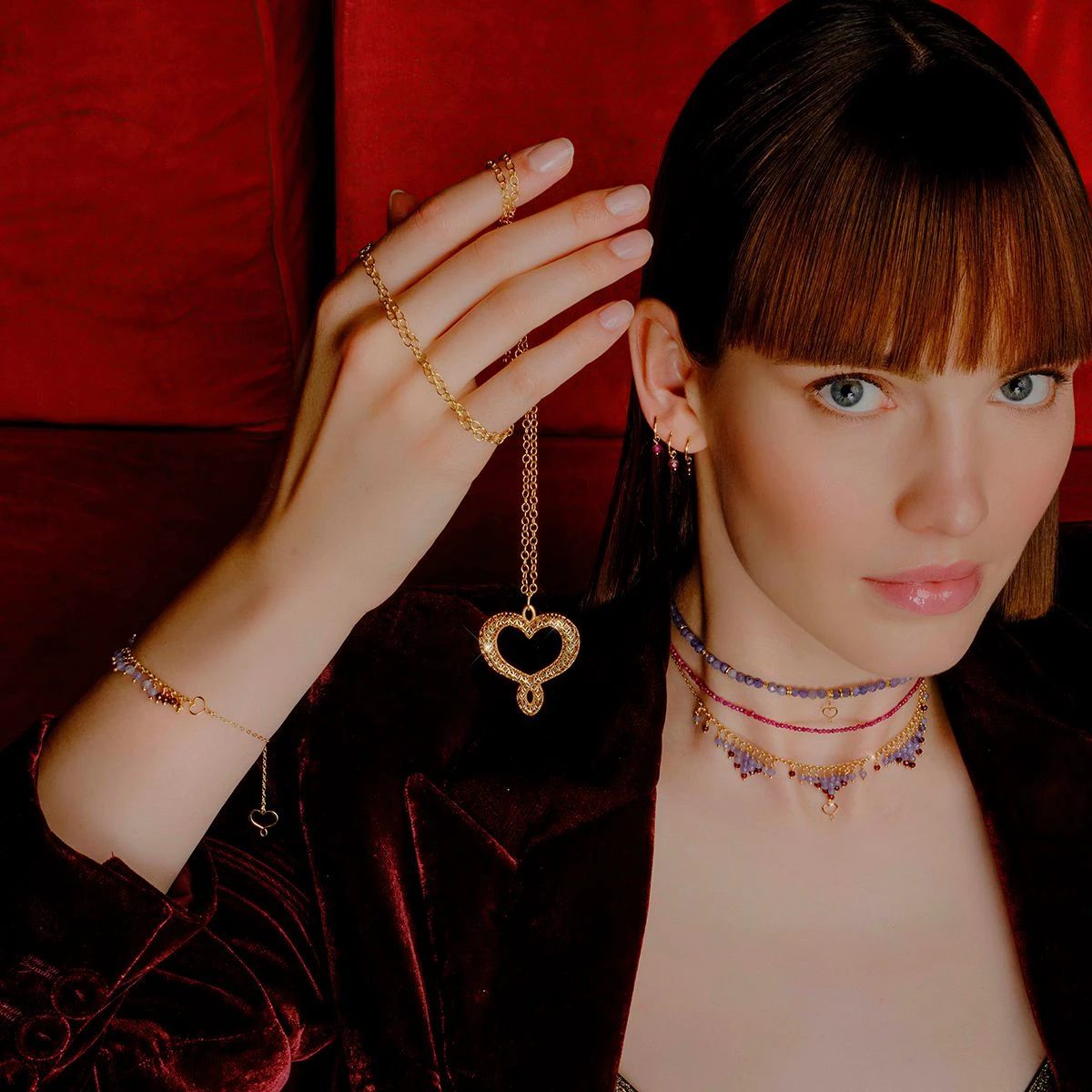 Gargantilla de la colección Fringes de Maman et Sophie, realizada en plata 925 de ley con baño de oro amarillo de alto espesor y alta resistencia. Presenta una cascada de piedras de tanzanita y granate con el corazón Maman colgante. Longitud regulable hasta 44 cm gracias a una pequeña perla deslizante. El extremo luce el corazón Maman calado como detalle distintivo. Cierre de broche.