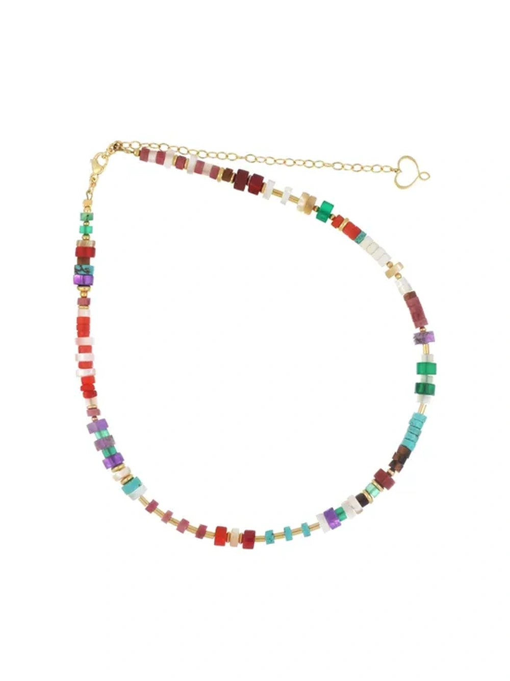 Gargantilla de la colección Madreterra de Maman et Sophie, confeccionada en plata 925 con baño de oro amarillo de alto espesor y alta resistencia. La pieza está recubierta en toda su superficie de piedras de amatista, aulita blanca, aulita turquesa, ágata verde, ágata roja, rodocrosita, ojo de tigre, jaspe rojo, coral bambú, nácar blanco y nácar marrón, alternadas con detalles decorativos en plata. Longitud regulable entre 35 y 44 cm. Extremo con corazón Maman calado. Cierre de mosquetón.