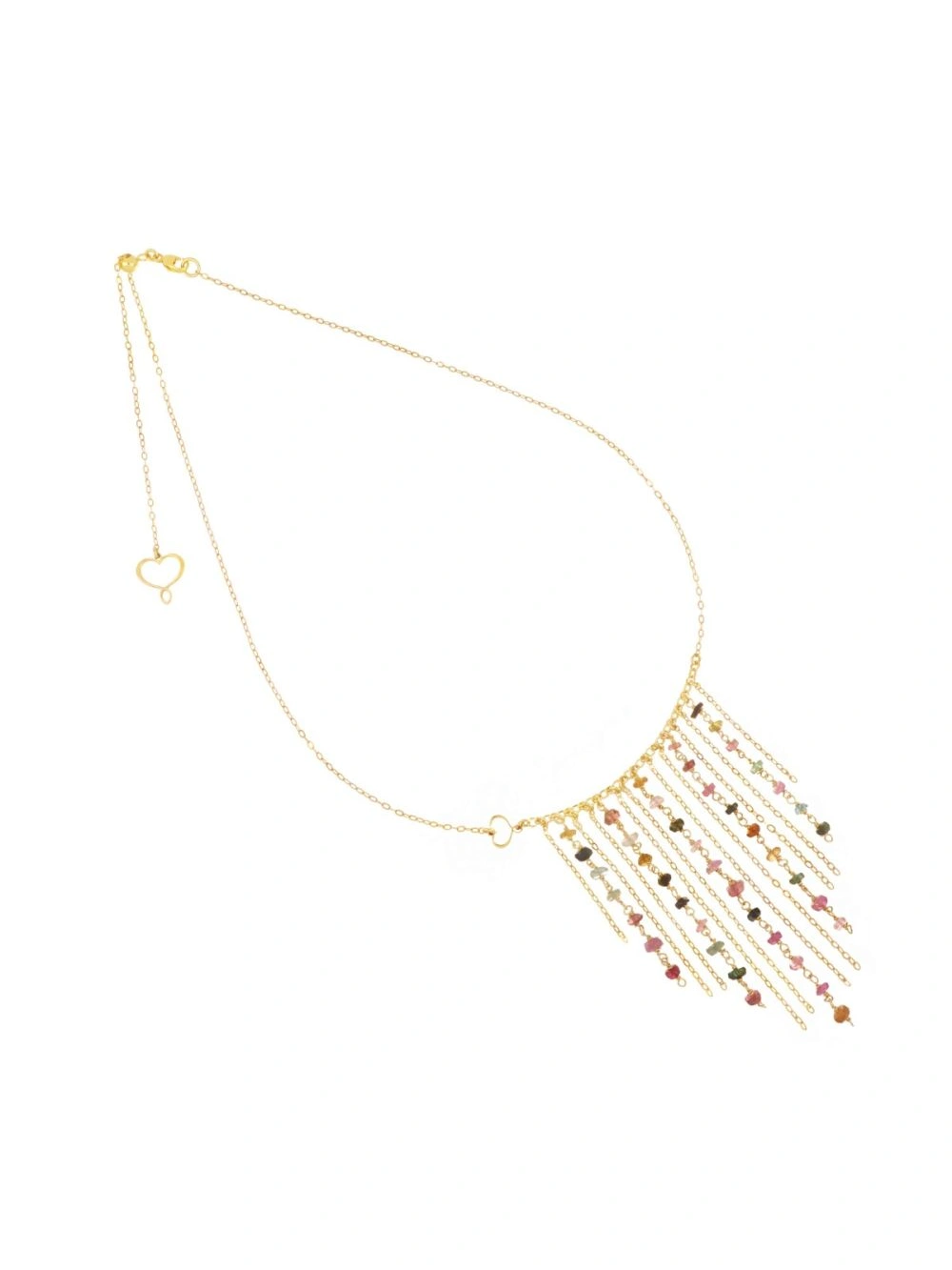 Gargantilla de la colección Woman in Chains de Maman et Sophie, fabricada en plata 925 de ley con baño de oro amarillo de alto espesor y alta resistencia. La pieza cuenta con una cascada de cadenas colgantes adornadas con piedras de turmalina multicolor y un corazón Maman. Longitud regulable hasta un máximo de 44 cm gracias a una pequeña perla deslizante. El extremo lleva el corazón Maman calado. Cierre de mosquetón.