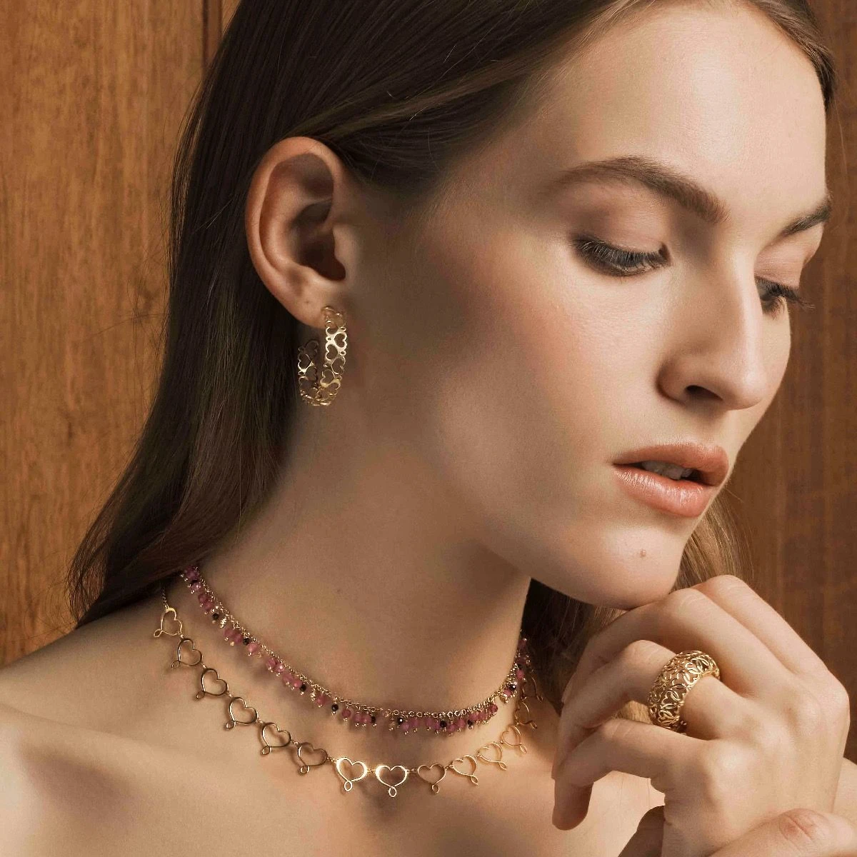 Pendientes de aro de la colección Maman de Maman et Sophie, confeccionados en plata 925 de ley con baño de oro amarillo de alto espesor y alta resistencia. El diseño presenta el motivo calado del corazón Maman en cada aro. Diámetro: 30 mm. Cierre de mariposa. Se venden por par.