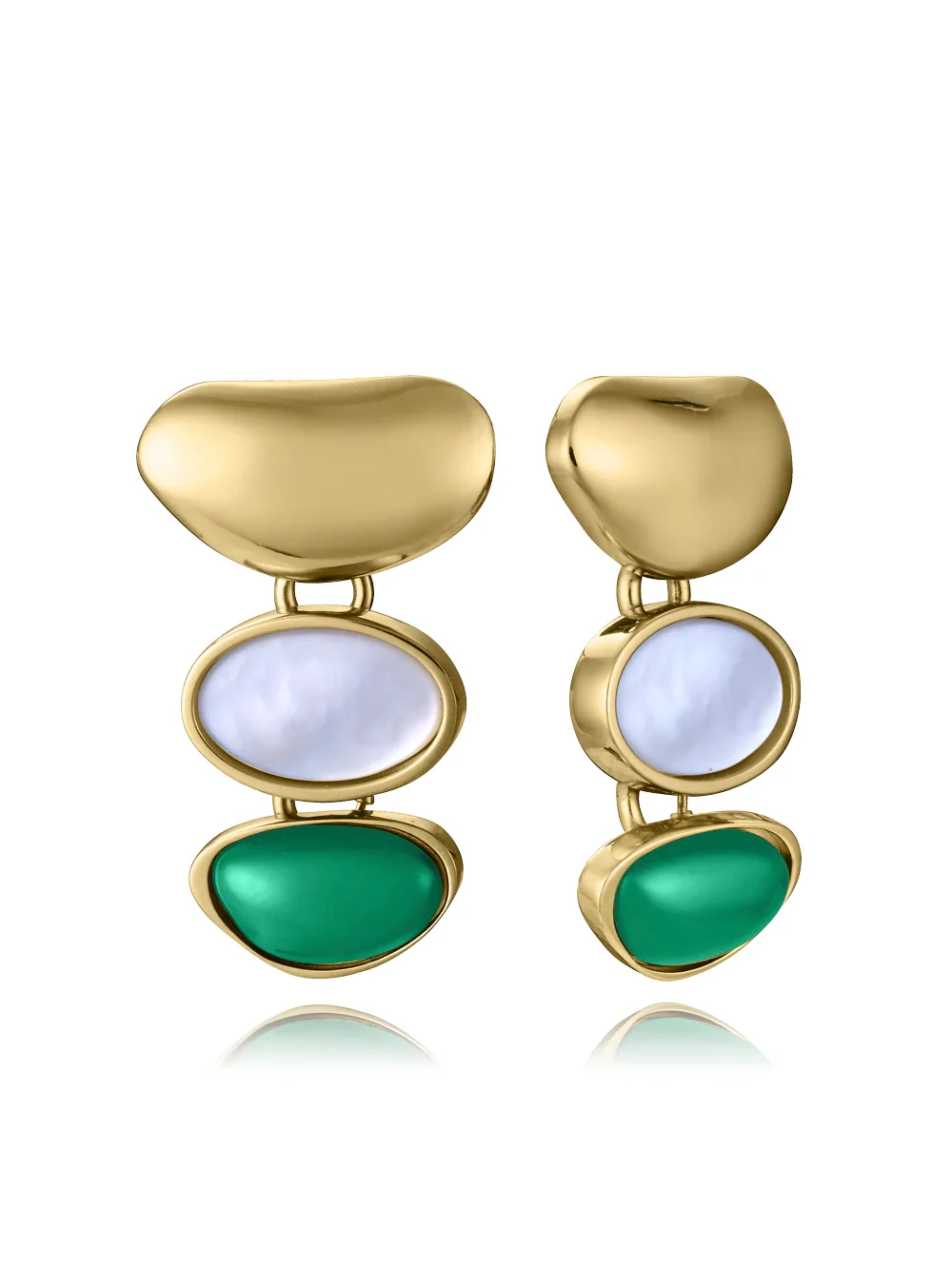 Exquisitos pendientes en acero inoxidable con lujoso acabado bañado en oro que aportan luminosidad y calidez a tu rostro. La combinación de madre perla y ágata verde en tonos naturales crea un efecto visual cautivador y lleno de frescura.