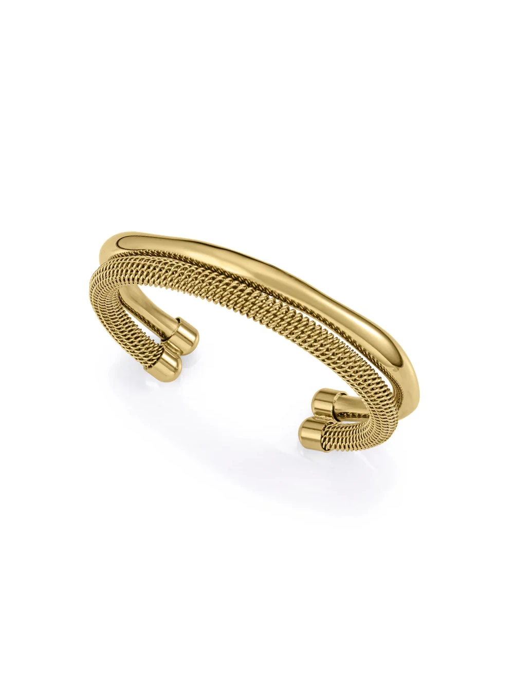 Sofisticada pulsera rígida de la colección Fashion mujer que fusiona diseño contemporáneo y distinción. Elaborada en acero inoxidable con acabado IP dorado, esta joya presenta una estructura dual innovadora: un brazalete liso que se fusiona armoniosamente con una malla metálica de textura refinada.
