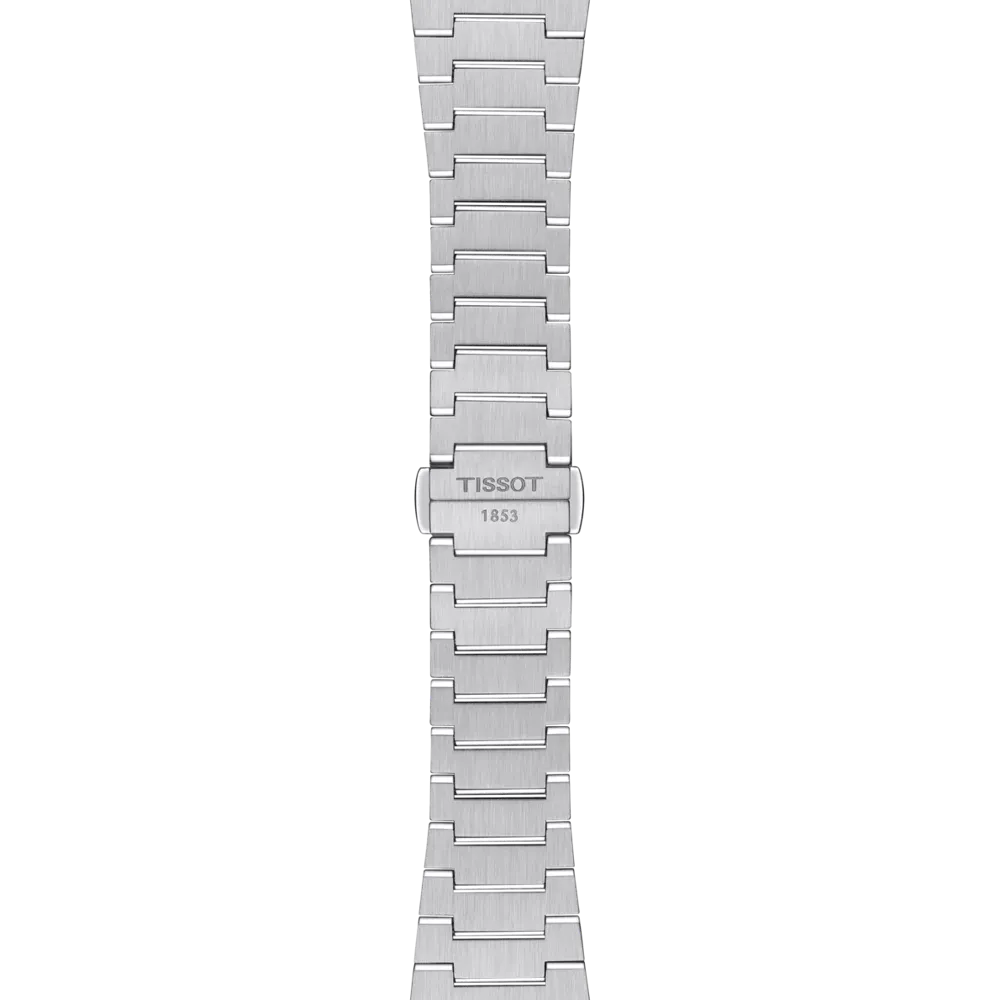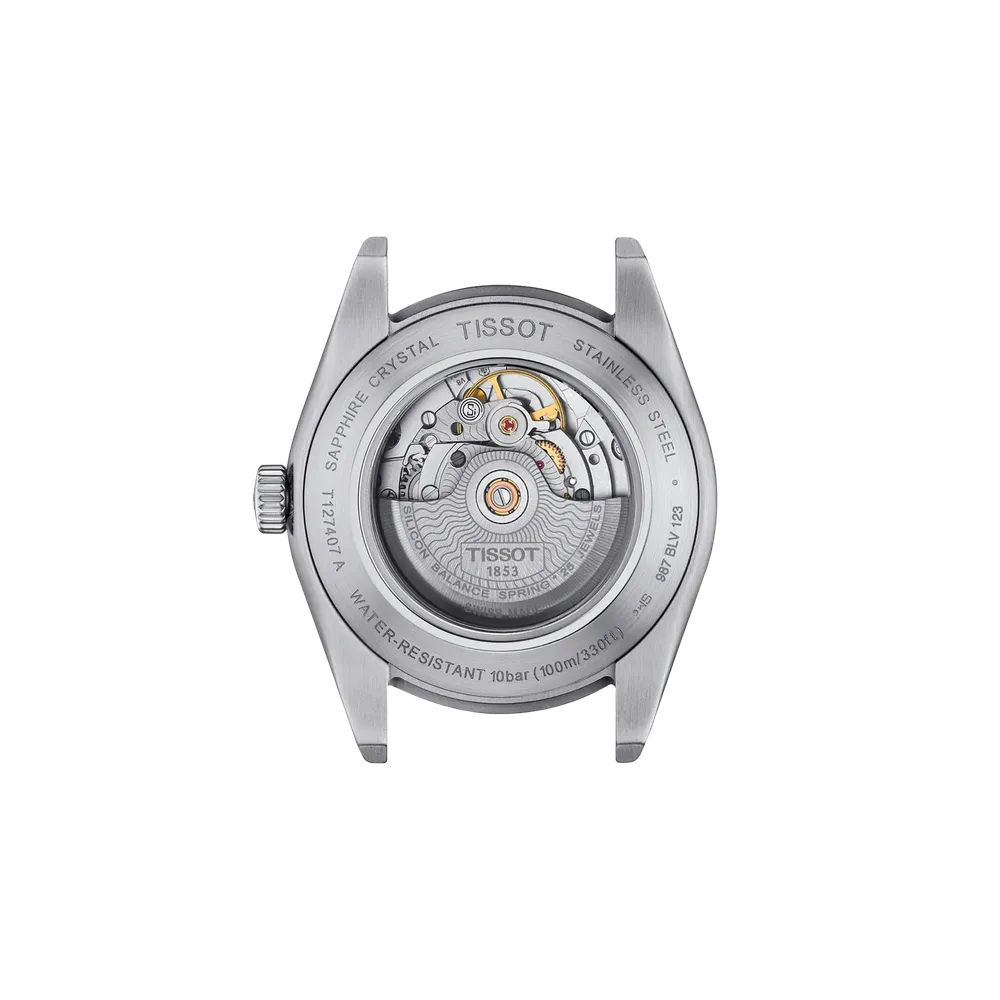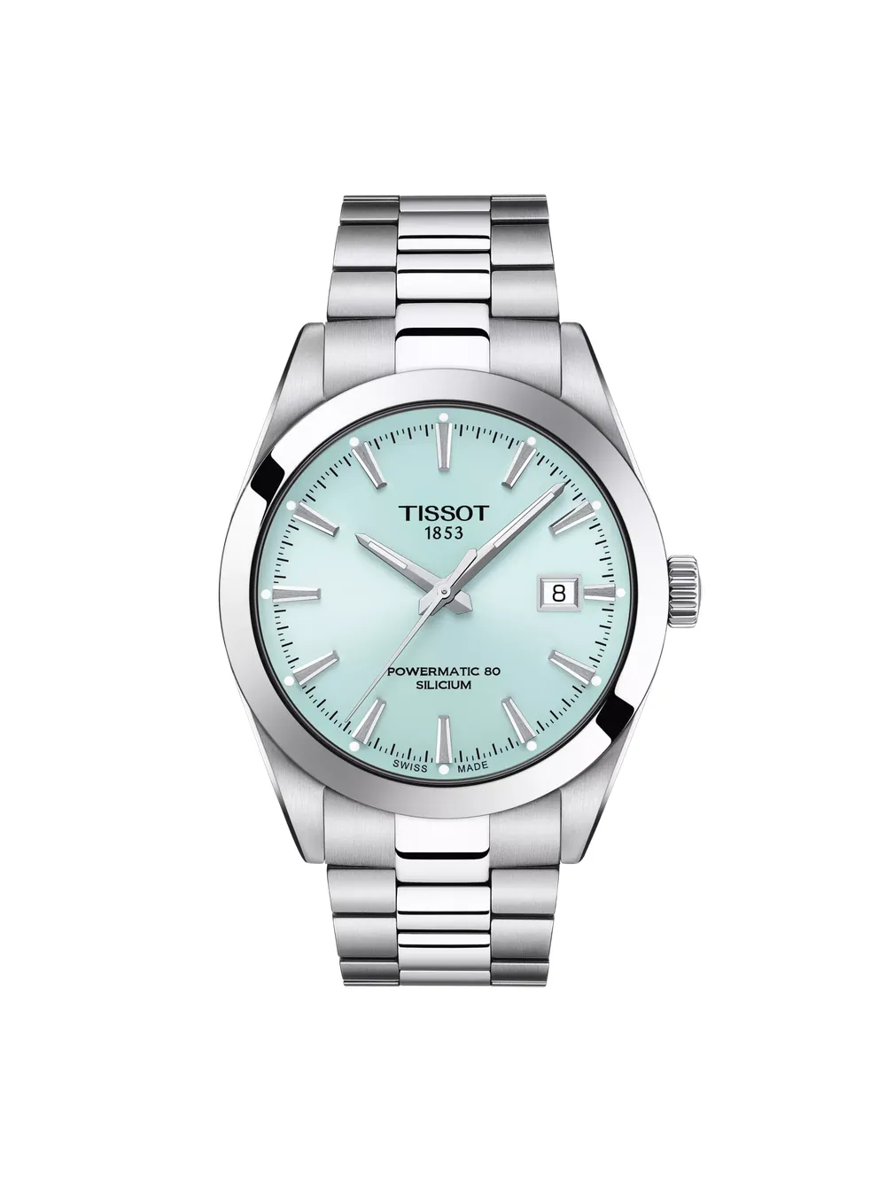 Tissot Gentleman de 40 mm con caja y brazalete de acero 316L. Incorpora movimiento automático Powermatic 80 con espiral de silicio, reserva de 80 horas, fondo transparente y cristal de zafiro abombado con tratamiento antirreflejo. Esfera azul hielo con índices aplicados y Super-LumiNova®, resistencia al agua 10 bar y brazalete de liberación rápida.