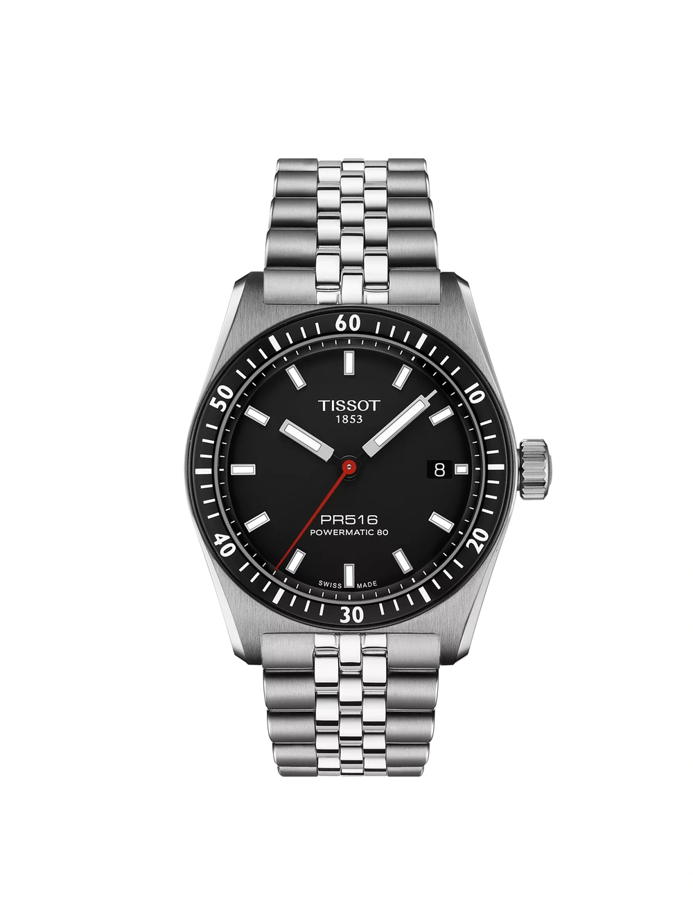 PR516 Powermatic 80 con caja de acero 316L de 38 mm y cristal de zafiro antirreflejo. Se inspira en el automovilismo, con esfera negra y agujas recubiertas de Super-LumiNova®, movimiento automático con 80 horas de reserva y espiral Nivachron. Brazalete de acero con cierre mariposa y sistema quick-release para alternar entre trabajo y ocio.