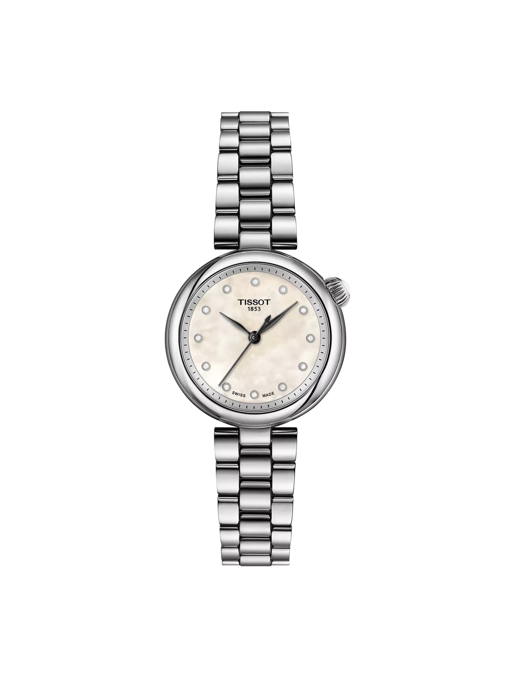 Reloj Tissot Désir con caja de 28 mm en acero 316L y cristal de zafiro curvado. Su esfera de nácar blanco luce 12 diamantes Top Wesselton para un total de 0,03 ct, y funciona con movimiento de cuarzo suizo con indicador de fin de batería (EOL). Resiste 5 bar, pesa solo 54 g y lleva brazalete de acero con cierre mariposa y liberación rápida.
