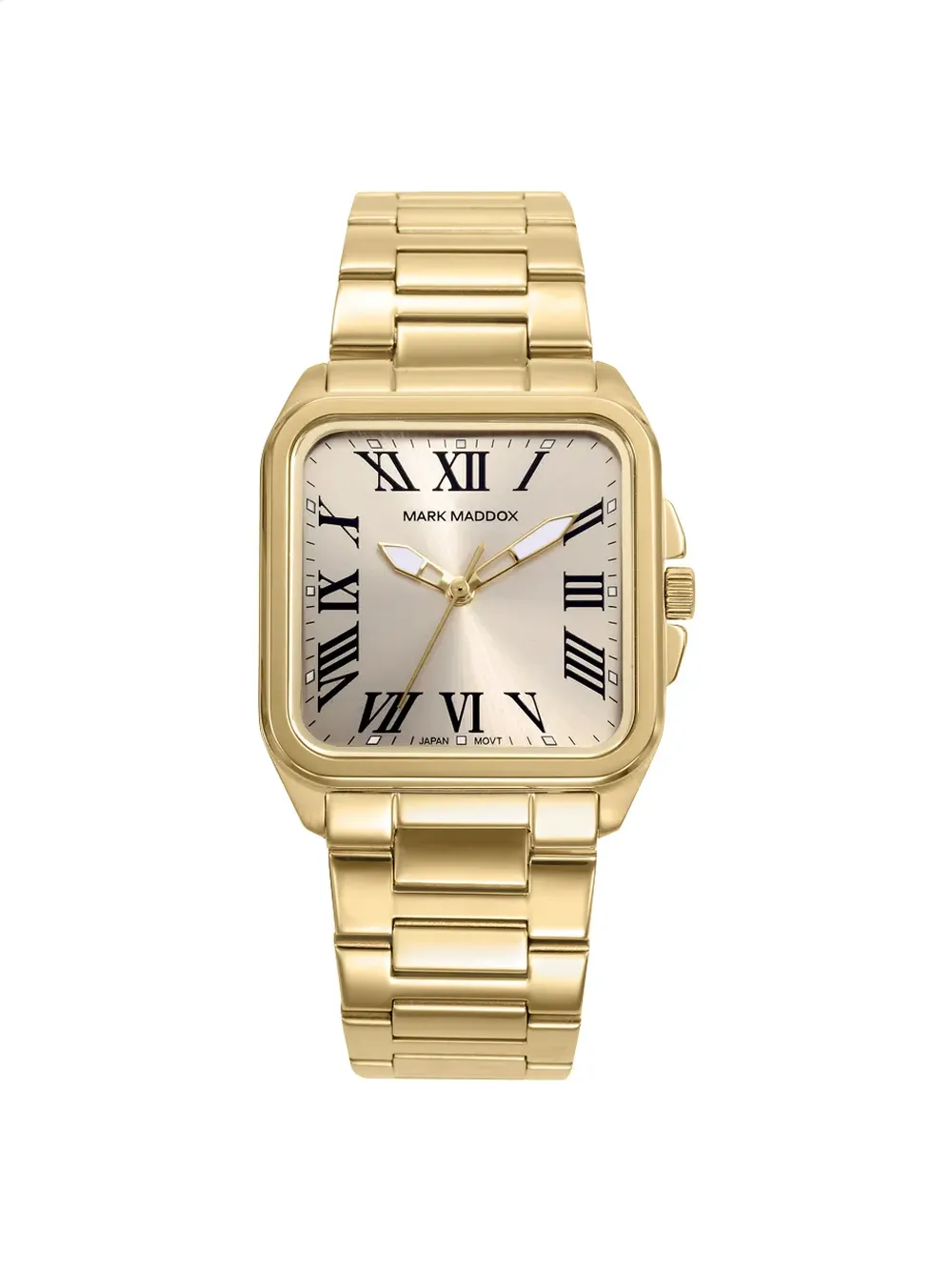 Movimiento de cuarzo analógico que asegura precisión constante. Brazalete integrado con eslabones articulados que abrazan