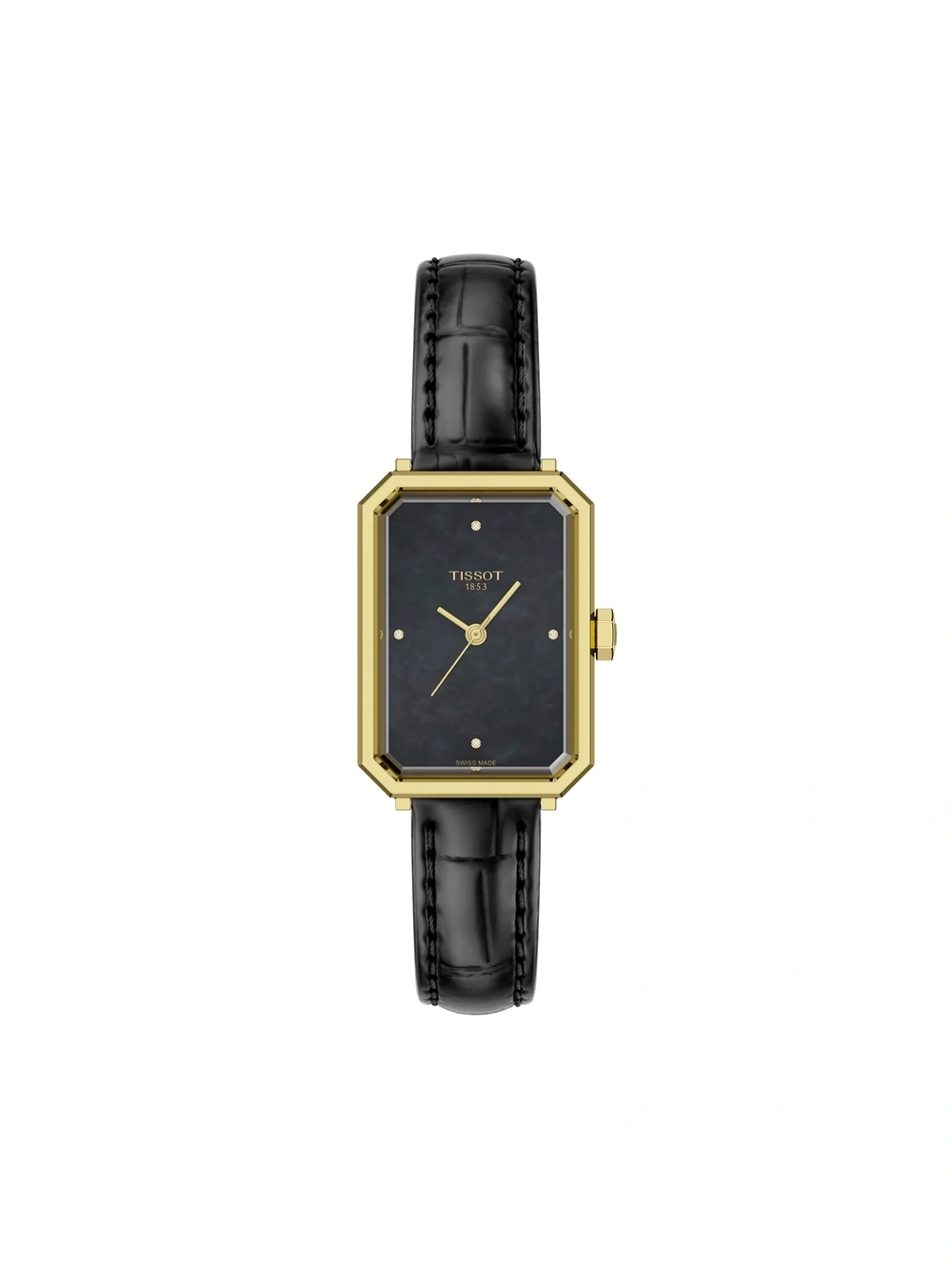 Reloj Tissot SRV de estética Art Déco con caja rectangular de acero inoxidable 316L con revestimiento PVD en oro amarillo y cristal de zafiro. Monta movimiento de cuarzo Swiss, esfera de nácar negro con cuatro diamantes y correa negra de piel con sistema intercambiable de fácil apertura. Su caja de 30 x 21,8 mm y su hermeticidad hasta 5 bares lo convierten en una pieza elegante, cómoda y práctica para el día a día o para ocasiones especiales. Un diseño refinado de la colección Classic Contemporary fabricado en Suiza.