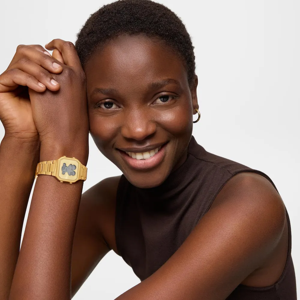 La versión más luminosa del oso en miniatura: íntegramente bañado en acero dorado, este reloj digital lleva la icónica silueta TOUS al pulso con una elegancia que mezcla lo contemporáneo y el brillo del oro para un resultado sofisticado y muy personal. Reloj digital D-Bear Mini. Caja y brazalete de acero inoxidable en acabado dorado completo. Medidas: 27×34,5 mm. Cristal mineral plano cuadrado. Pantalla LCD iluminada. Resistente al agua 3 ATM. Pila CR1620 3V. Funciones: hora, fecha, cronógrafo y alarma. Cierre desplegable con pulsadores.