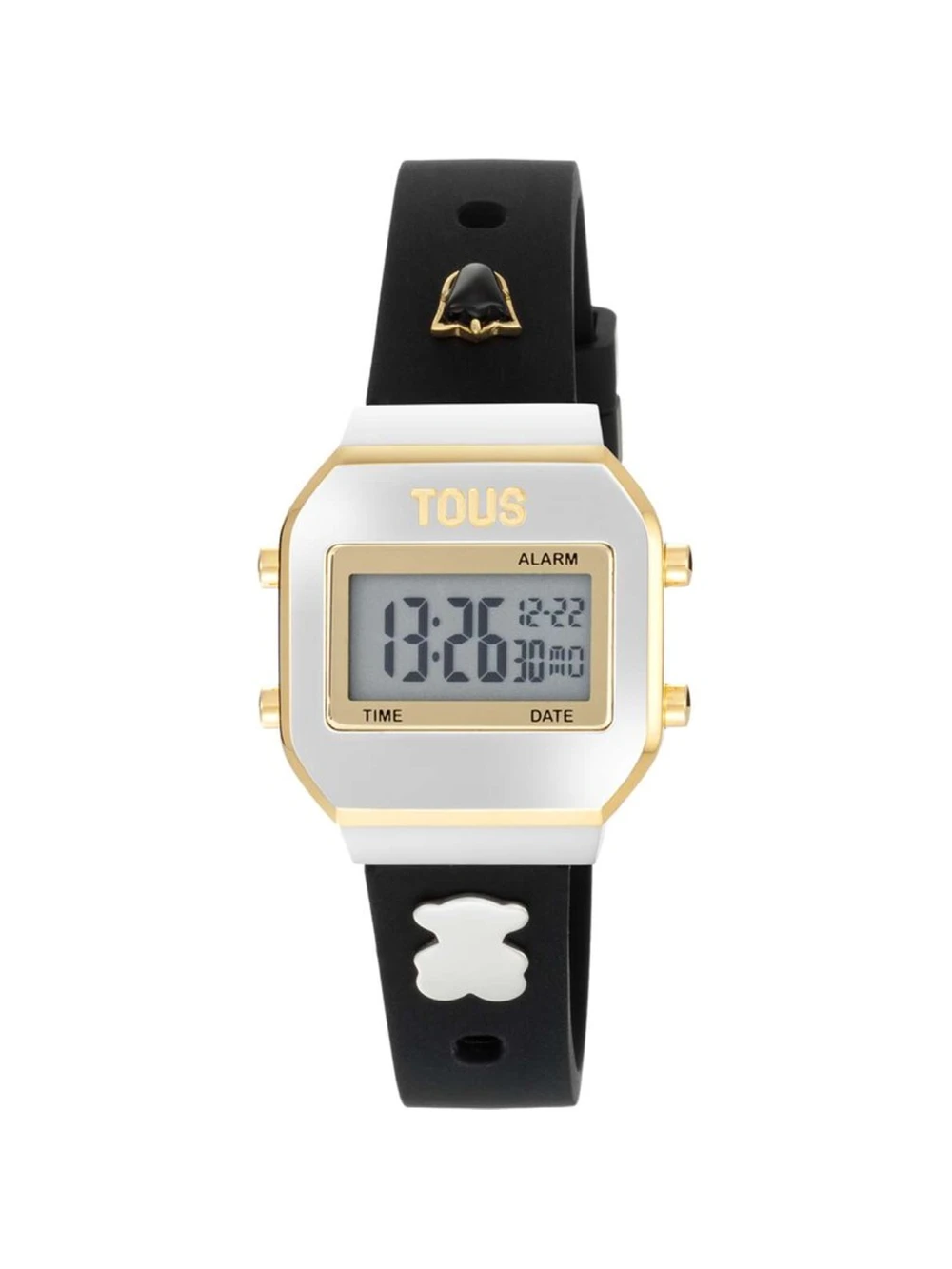 Para quienes buscan un reloj con carácter propio, el TOUS XPRESurSLF en versión bicolor es la respuesta. La caja de acero bicolor y el brazalete de silicona negra crean una combinación audaz y contemporánea que destaca en cualquier look. Los charms intercambiables permiten personalizar el reloj según el momento, transformando un accesorio cotidiano en una declaración de estilo. Esfera digital en gris con cristal mineral, impermeabilidad de 3 ATM y movimiento digital de cuarzo para un uso sin preocupaciones. Con tres años de garantía TOUS.