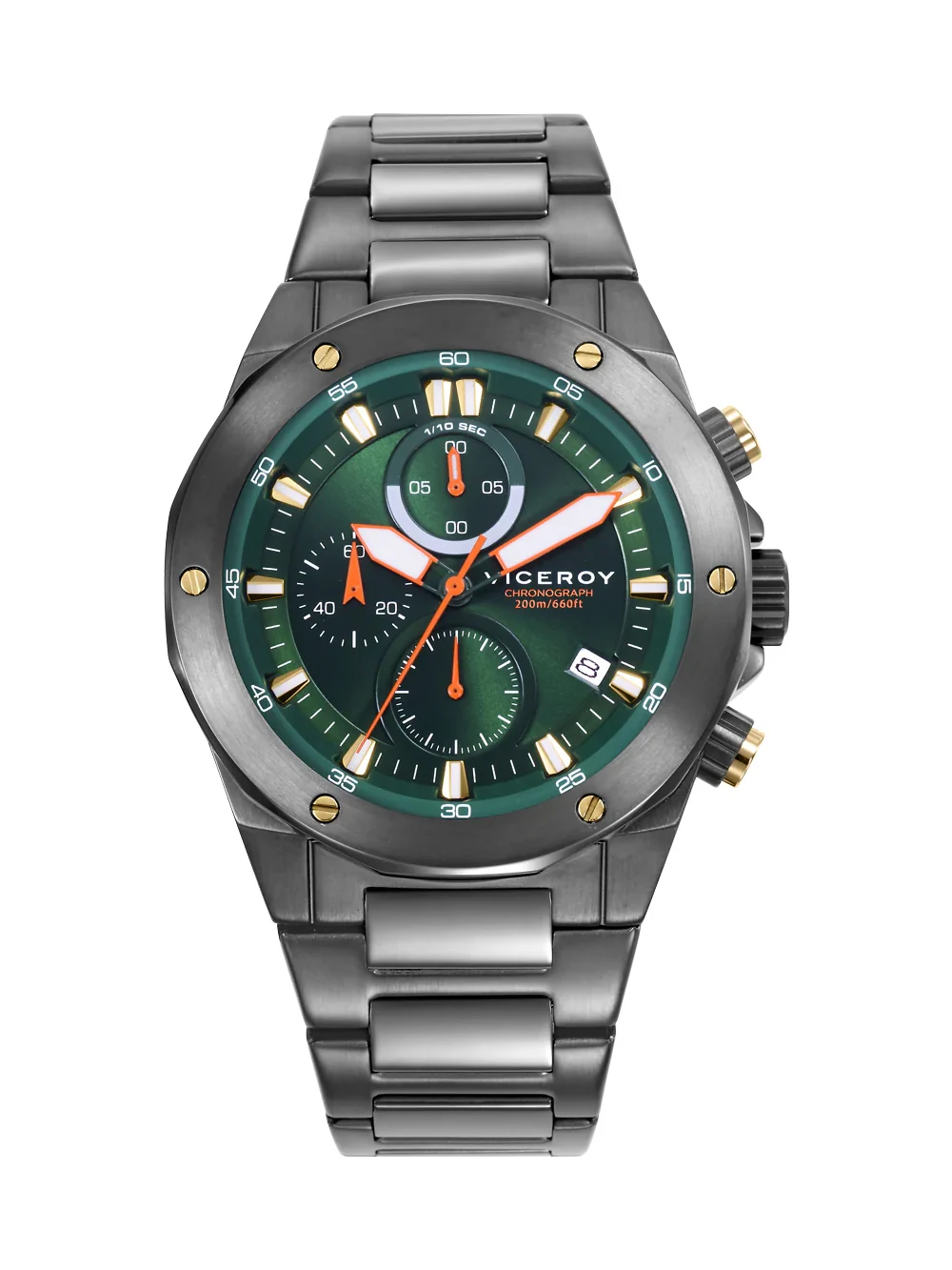 Este cronógrafo deportivo Viceroy combina funcionalidad y estilo en un diseño robusto de 44 mm. Su caja circular en acero con acabado bicolor IP azul crea un contraste llamativo con la esfera azul, protegida por cristal mineral resistente.