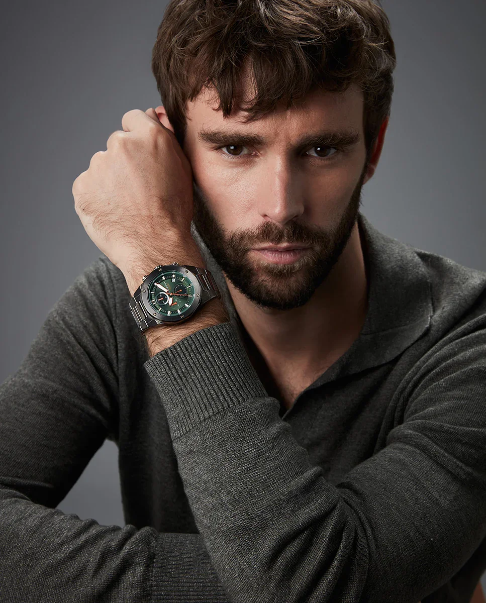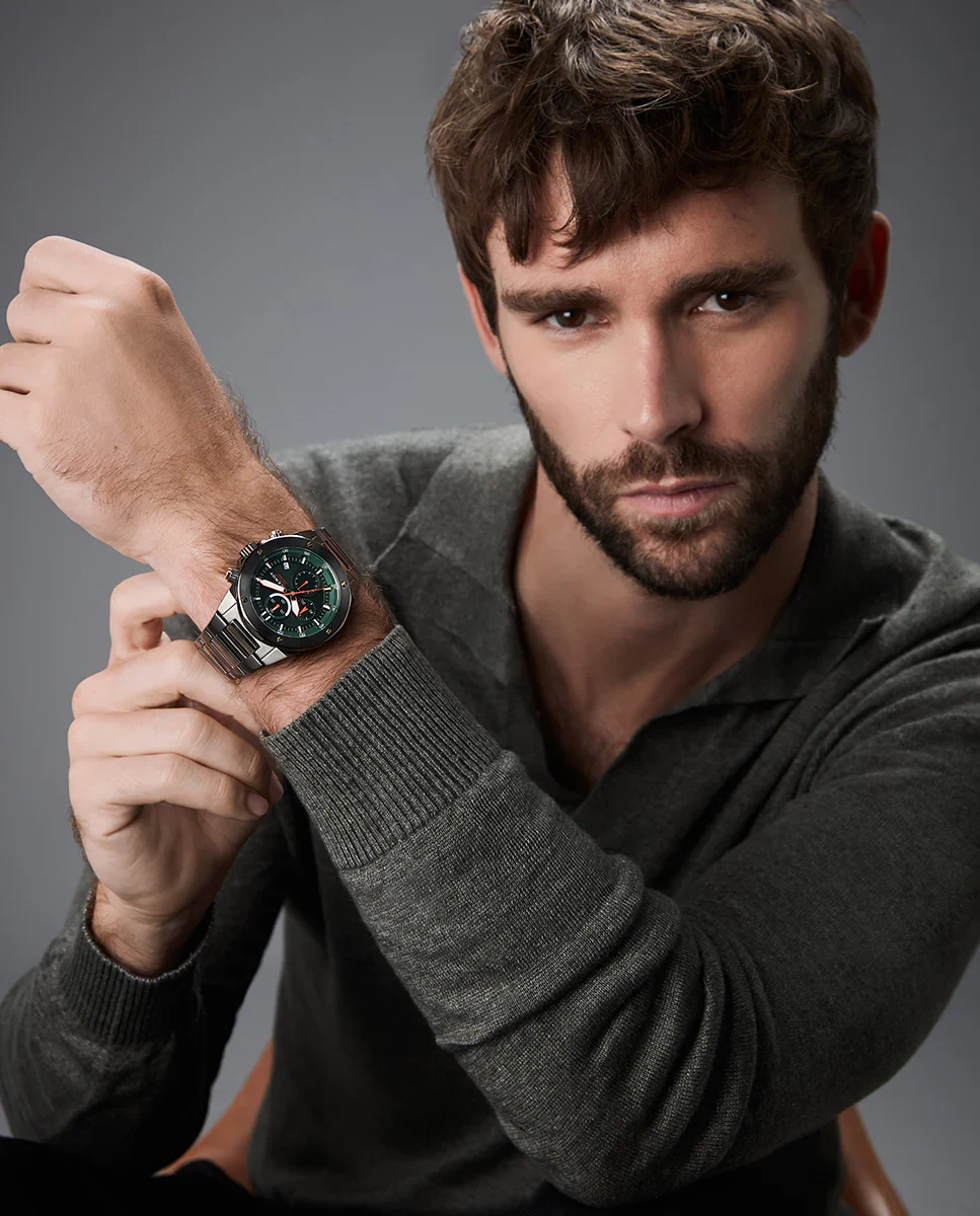 El brazalete en acero se ajusta mediante cierre desplegable de seguridad, garantizando comodidad y firmeza en la muñeca. Su movimiento de cuarzo con cronógrafo ofrece precisión en cada medición, mientras que su resistencia al agua hasta 200 metros lo convierte en el compañero perfecto para actividades acuáticas y deportivas.
