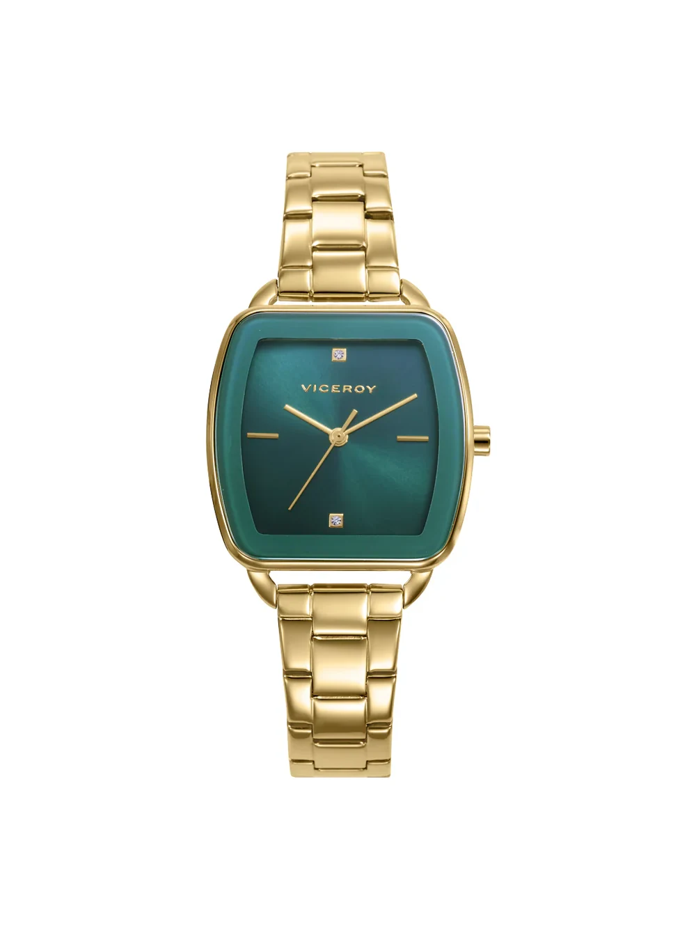 Este reloj combina elegancia y color en su caja rectangular de acero dorado. La esfera y bisel en tonos verdes contrastan con índices tipo barra dorados embellecidos con cristales brillantes, creando un efecto luminoso y sofisticado.