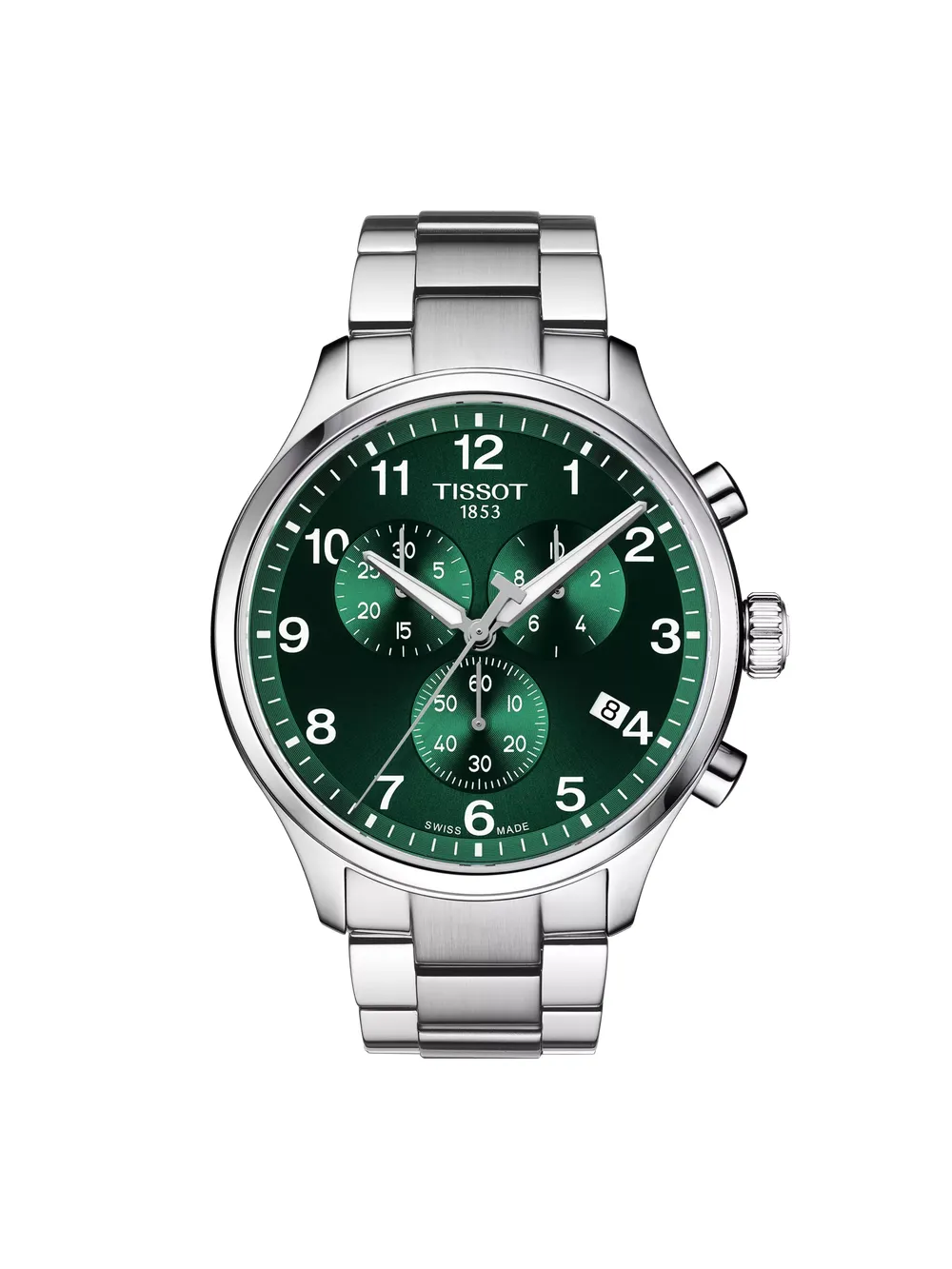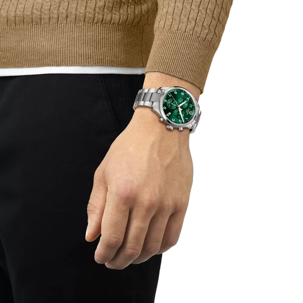 Reloj Tissot Chrono XL Classic con caja de acero inoxidable de 45 mm y esfera verde. Equipado con cronógrafo de cuarzo suizo, indicador EOL y cristal de zafiro abombado resistente a arañazos. Diseño deportivo con números arábigos y aguja luminosa, resistencia al agua 10 bar y cierre de mariposa con pulsadores.